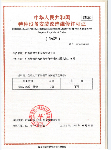 廣西高普工業設備有限公司的前身是南寧高普熱能設備有限公司,是一家成立于1998年,具有獨立企業法人資格的的有限責任公司。公司總部設在廣西首府南寧。在云南、宜賓等多處地方、地區設有辦事及分公司。 本公司是高新技術企業,持有國家技術監督局頒發的1級《特種設備安裝、改造、維修(鍋爐)》許可證,1級許可證是最高級別,可安裝、改造、維修任何形式、參數的鍋爐設備。并持有《壓力管道》安裝、改造維修許可證,1級《壓力容器》安裝、改造、維修,機電設備安裝工程專業承包3級等資質。 公司擁有雄厚的人力資源和技術裝備力量。在現有正式員工中,鍋爐及相關專業工程技術人員55名,其中高級工程師10名,工程師32名。持證焊工55名,持有合格項目七十多項次,項目中包含了一類鋼種和二類鋼種的各種形式的電弧焊及氬弧焊。無損檢測人員11人,Ⅲ級2人,II級9人,項目包括含常規四種探傷方法。機電設備安裝專業工程人員58人,撻有相關專業證書涵蓋40多項專業項目。其中:宜賓分司駐有員工108人,其中工程技術人員23人,高級工程師3人,工程師7人,助理工程師13人,持證焊工20人,II級無損檢測人員5人。 本公司多年專業從事鍋爐設備的安裝、改造、維修工作,擁有多名業內知名的鍋爐專家,有技術過硬的施工隊伍,在制糖行業、造紙、發電行業等領域,有良好的聲譽。..詳細